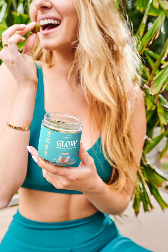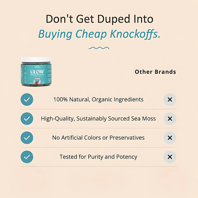 GLOW combines Sea Moss + Pearl Powder + Liposomal Vitamin C + Blue Majik— a unique, antioxidant-rich blend not found in generic products. Plus, we use only lab-tested, organic ingredients with no artificial fillers or colors.